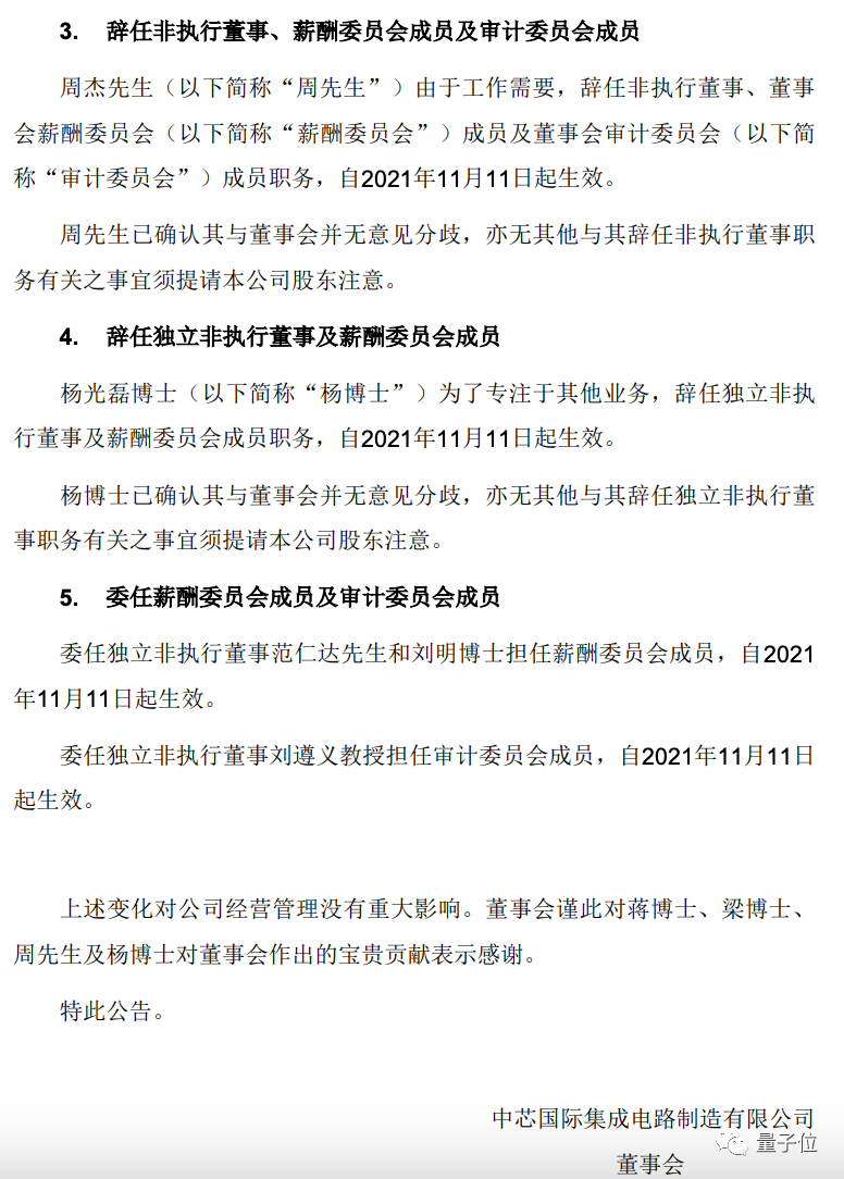 中芯国际最后表示:短期内公司不会增加董事人数,上述变化对公司经营管理没有重大影响。