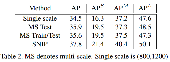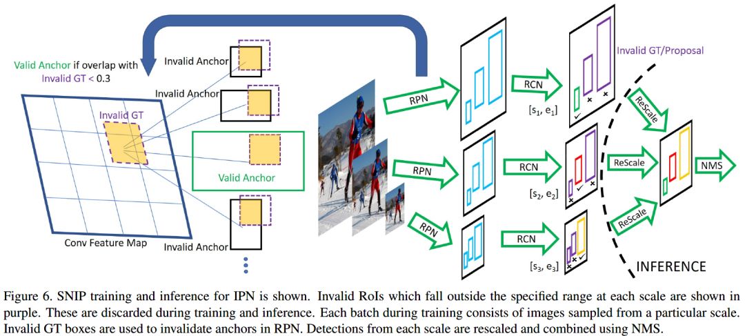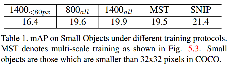 作者提出,在训练时,既希望训练数据有尽可能多的外观变化,又想将物体的尺度限制在一个合理的范围内。因此作者提出了SNIP训练方法,使用MST(多尺度图像训练)方法时,只训练目标尺度在特定范围(与预训练的图像尺寸接近)的图像,在反向传播时,忽略其他过大过小的图像。