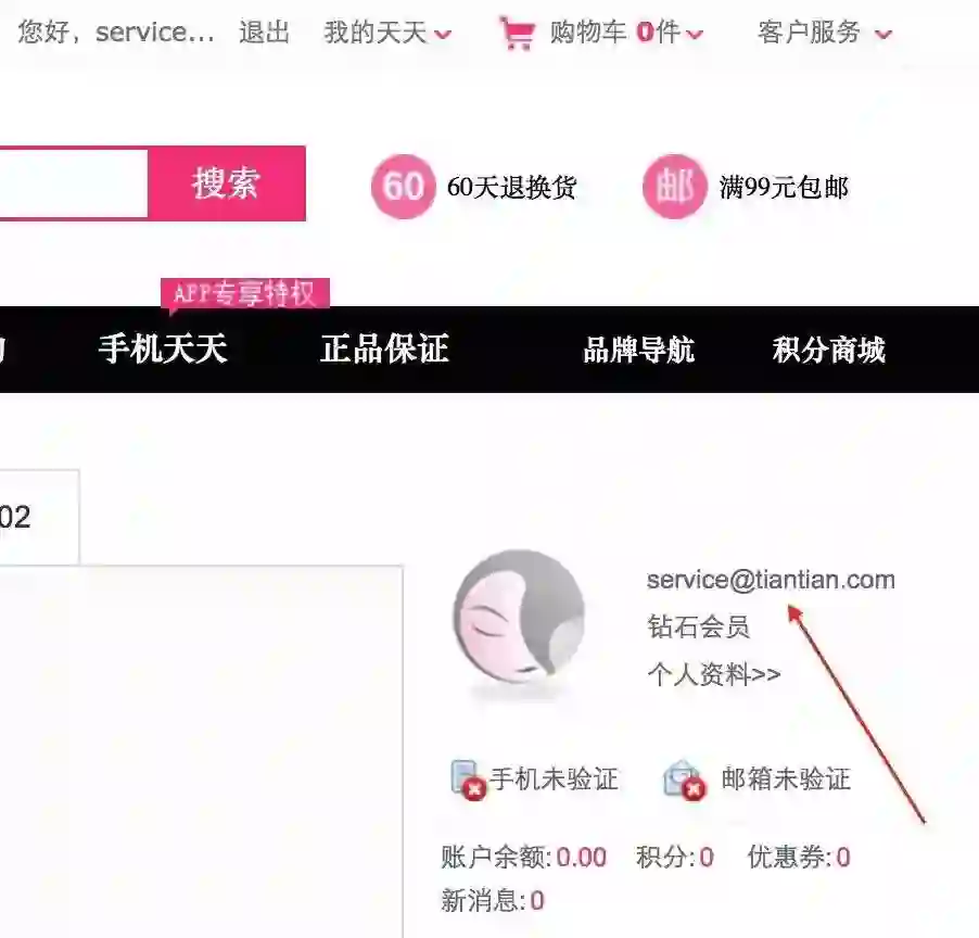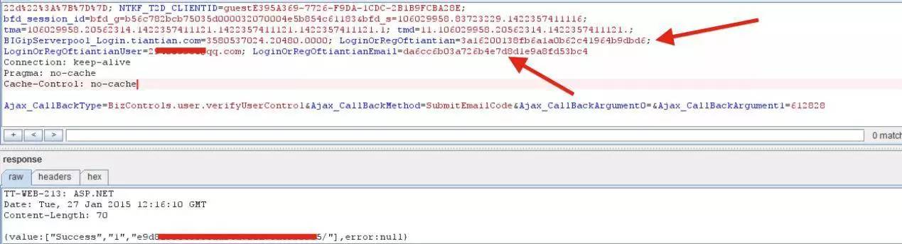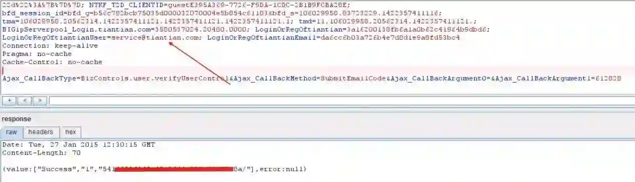 这个是第二步中抓到的包 把 cookie 中的 LoginOrRegOftiantianUser 值 改成要重置的账号。这里我拿 service@tiantian.com 测试。