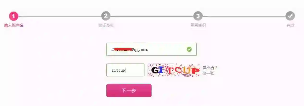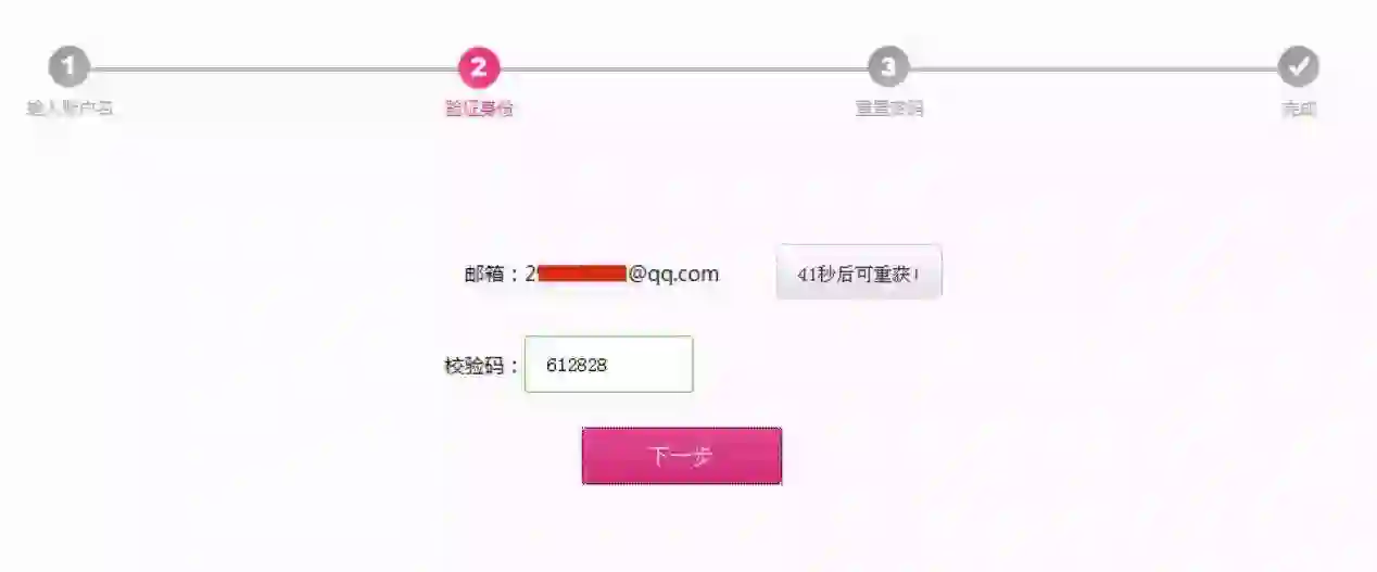 可以看到成功返回了加密字符串既然拿到了字符串,下一步就是重置密码了。首先输入邮箱和验证码,点击下一步,这一步是必须要做的,要不然不会成功。