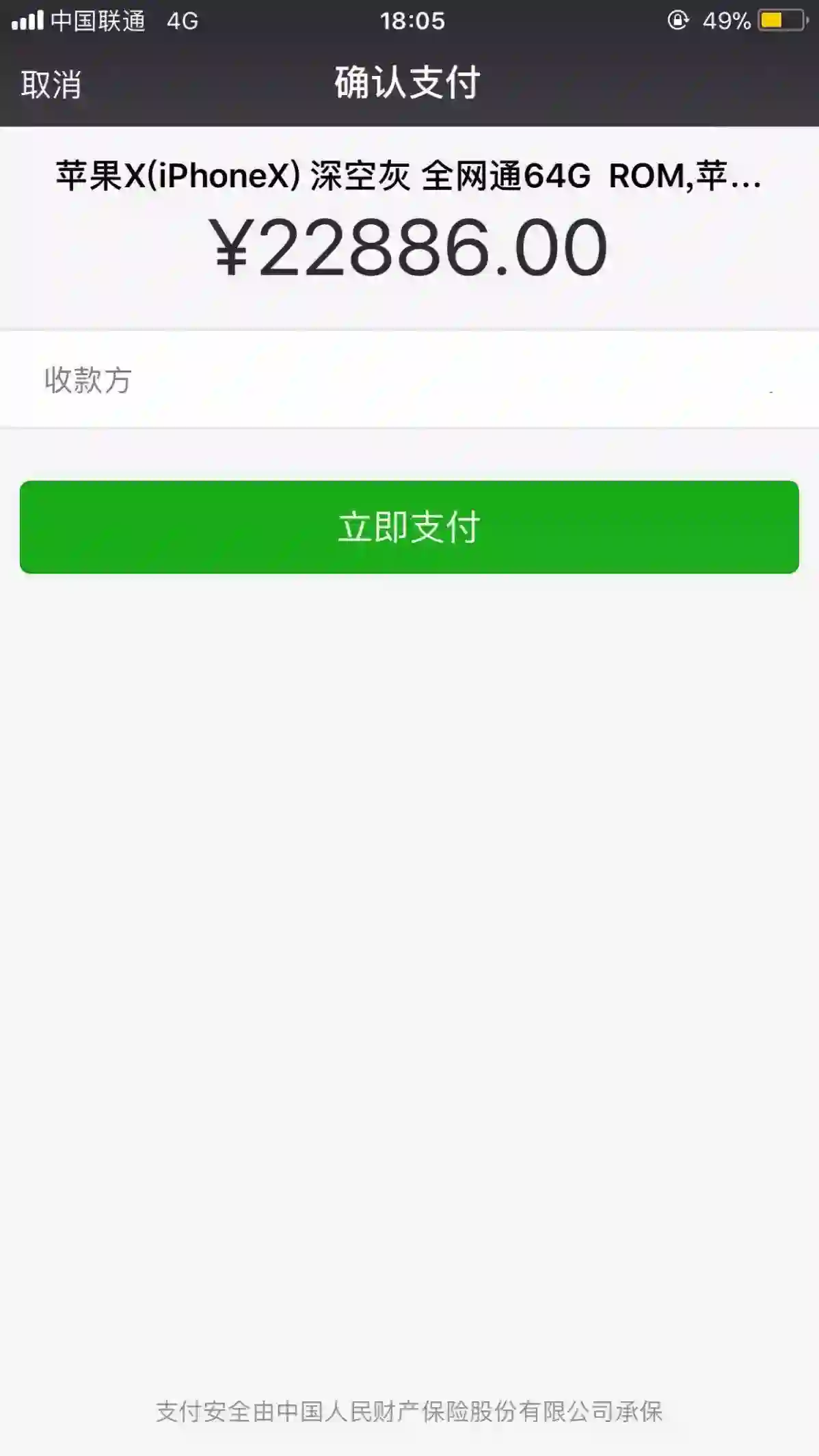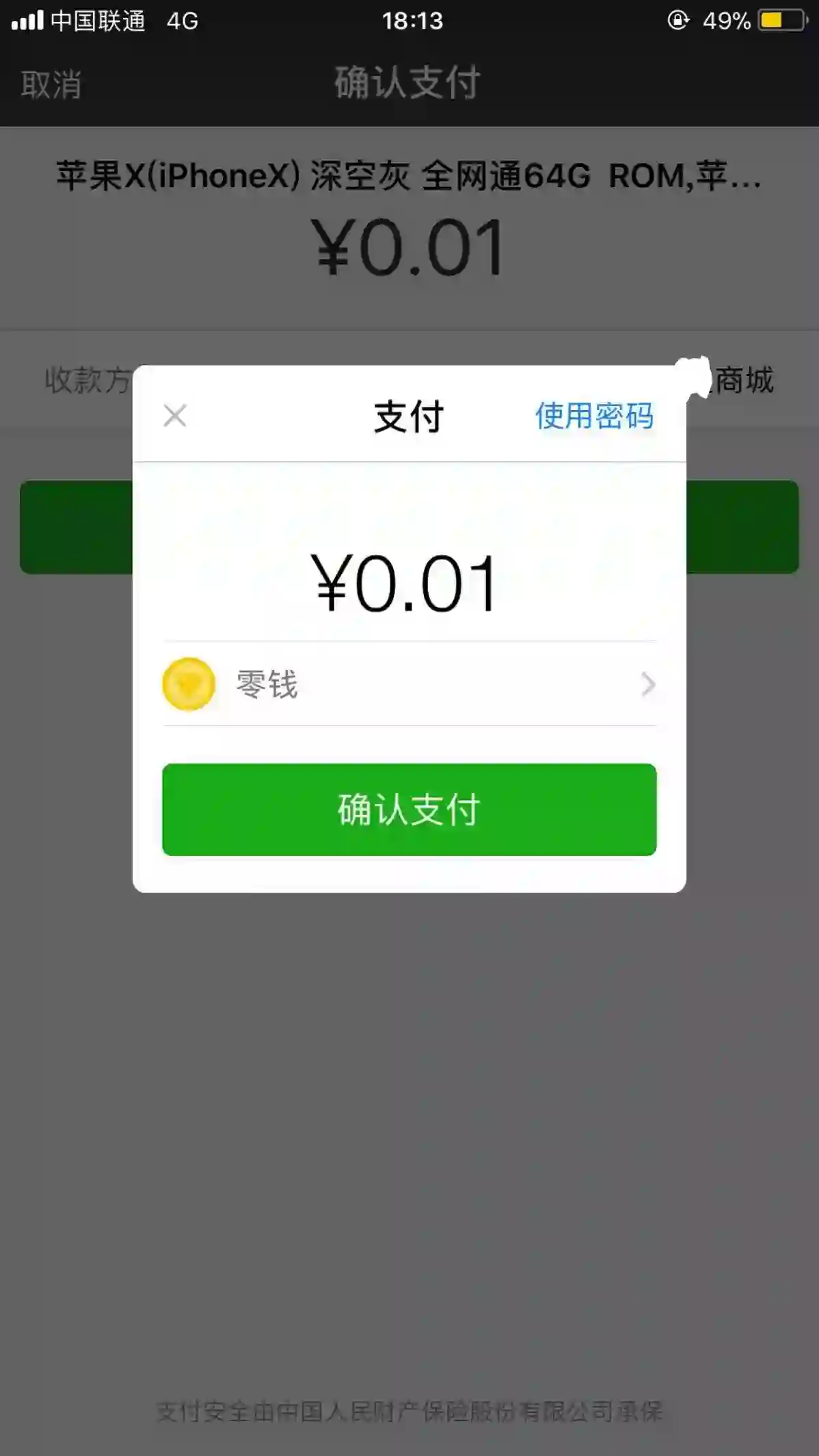 不过这里我只想让这台价值八千的 iPhone X 变成 0.01 购买,那么我们放包,进入支付页面。