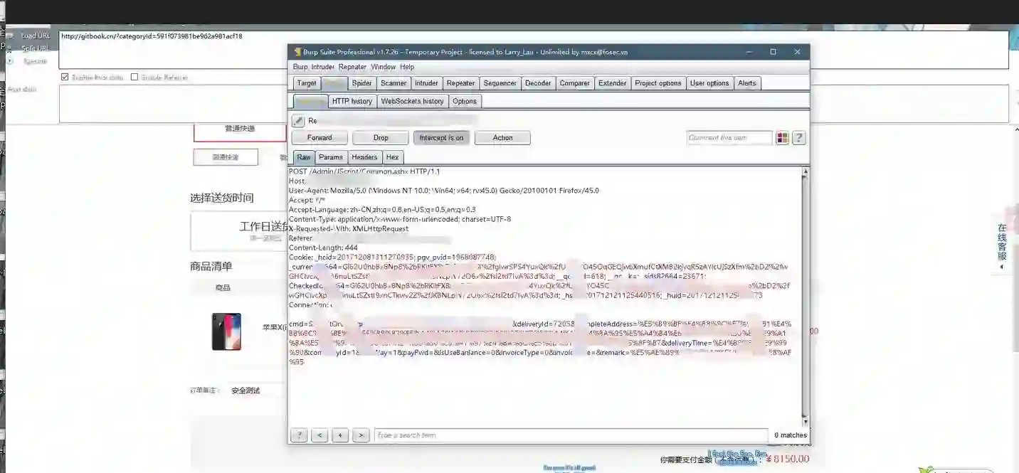 在选购了 iPhone X 的付款页面我进行了抓包,显示结果如上图所示。