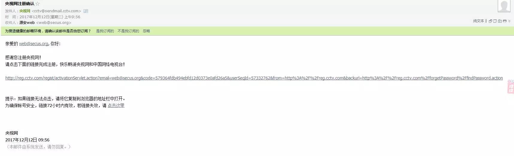 感谢您注册央视网! 请点击下面的链接完成注册,快乐畅游央视网和中国网络电视台! http://reg.cctv.com/regist/activationServlet.action?email=web@secus.org&code=579364fdb494ebfd12d0373e0afd26a5&userSeqId=57332762&from=http%3A%2F%2Freg.cctv.com&backurl=http%3A%2F%2Freg.cctv.com%2FforgetPassword%2FfindPassword.action 提示:如果链接无法点击,请将它复制到浏览器的地址栏中打开。 为确保帐号安全,链接 72 小时内有效,若链接失效,请点击这里