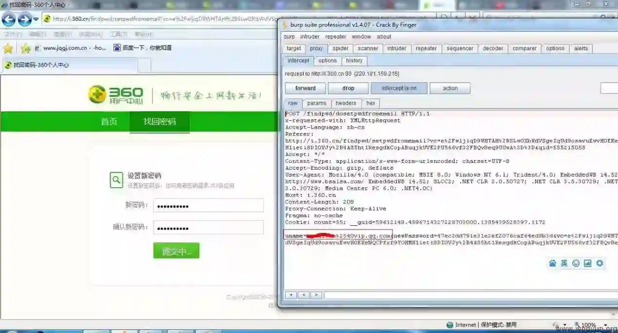 而且这里还发现,我们在知道邮箱,不知道 qid 的情况下,也可以修改密码:首先用自己的账号获取一个 360 找回密码的 URL,然后在修改密码时截包。