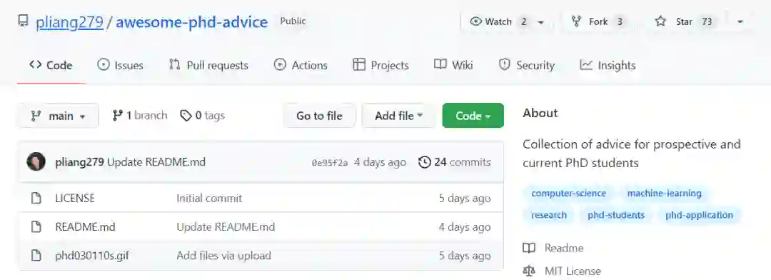 最近卡内基梅隆大学的一位博士生建立了一个GitHub仓库,收集了上百个大咖对博士生涯的研究建议,从准博士需要的读书计划、访问日、选择学校,从博士生存指南、如何读论文、写论文、写Review等等应有尽有。