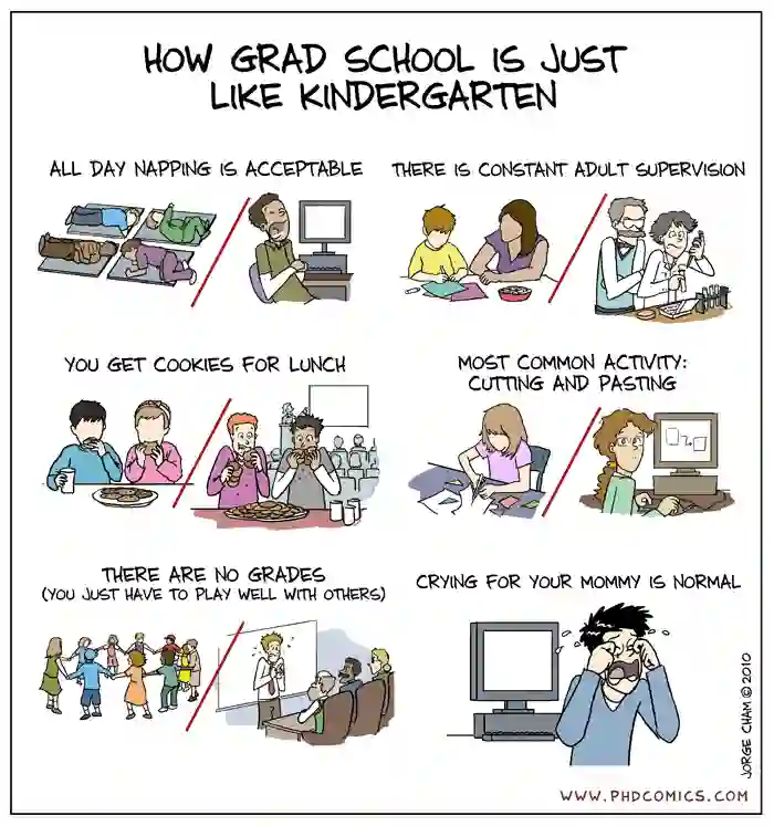 一篇漫画曾描绘过,研究生其实和幼儿园小朋友是一样的,整天摸鱼也行、有一个导师、工作基本就是粘贴、没有分数、只需要和其他人玩的开心就好、并且时常向妈妈诉苦。