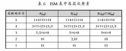 为将可达矩阵通过变换作出层级有向图,需要定义两个集合,可达集合R(Mi)和先行集合A(Mi)。R(Mi)表示Mi可以到达的集合,由可达矩阵Mi中所有元素为l的列标组成;先行集A(Mi)表示可以到达Mi的前因集,由可达矩阵中Mi列的所有元素为l的行标组成。根据R(Mi)=R(Mi)∩ A(Mi)确定最高层元素Mi,同时,在可达矩阵中剔除所有最高层因素所在的行和列,再在余下的可达矩阵中采用相同方式,找到新矩阵中的最高层元素(第4层要素),循环迭代,直到找出表6所示各层要素集。