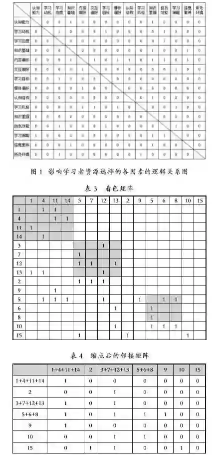 根据ISM方法,将15个因素分别在行和列上排序,因素之间的关系用0和1表示,当横坐标的因素对纵坐标的因素有直接影响时,所在的单元格用1表示,否则用0表示。比如,第一行中,学习者的认知能力直接影响其知识基础,因此,相应的位置取值为1。我们在查阅大量文献的基础上,对15个因素之间的相互关系进行了反复查证,同时又与5位研究生反复讨论,最后确定如图1所示的影响学习者资源选择的因素间的逻辑关系图。