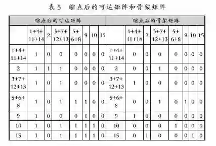 在一个环路里,各个节点之间构成强连接关系,将具有强连接关系的各个节点合并成一个节点,便完成了缩点运算,缩点后的邻接矩阵如表4所示。