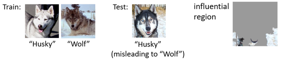 人们已经发现标准的有监督学习方法,特别是深度学习方法对分布外样例的预测表现欠佳。例如图1中的例子[Ribeiro’16],若训练集中大部分“哈士奇”的图片都是暗背景而大部分“狼”的图片都是雪地背景,那对于处在雪地中的“哈士奇”的测试样例,模型会预测为“狼”。若对模型进行可视化可发现模型更关注于背景,因为在这样的数据集上,背景与前景物体具有很强的关联性,并且背景是一个比前景物体更有区分度的特征,但只有前景物体决定图片的标注。