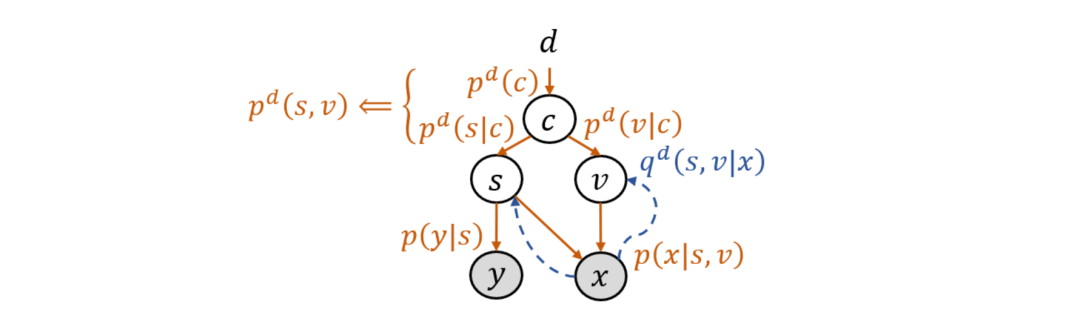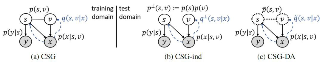 基于这个因果角度的考虑,研究员们提出了“因果语义生成模型”(Causal Semantic Generative model, CSG),如图2(a)所示(注意基于前面的考虑,图中去掉了v→y)。此外,根据上面的例子,s和v在特定环境中常会相关,例如“哈士奇”/“狼”常与暗背景/雪地背景一起出现,但此相关性并非因为两者间有因果关系,比如把“哈士奇”放到雪地中不会让它变成“狼”,也不会把背景变暗。因此研究员们使用了一个无向边来连接它们。这不同于大部分已有工作,那些工作认为各隐因子间都是独立的。