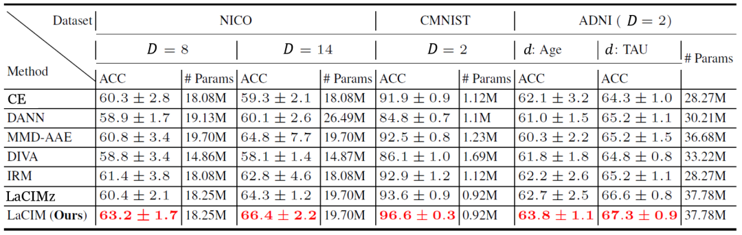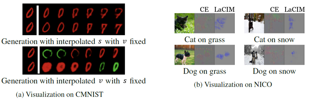 在实验中,研究员们选择了一些最新的领域泛化数据集,包括 NICO 自然图片数据集、彩色 MNIST,以及预测阿尔兹海默症的 ADNI 数据集。表2中的结果表明 LaCIM 取得了最好的表现。可以注意到 LaCIM 也比不区分 s 和 v 的变种 LaCIMz 表现好,说明了将 s 和 v 分别建模的好处。图6中的可视化分析表明,LaCIM 很好地区分开了语义和多样因子,且关注图片中具有语义信息的区域。