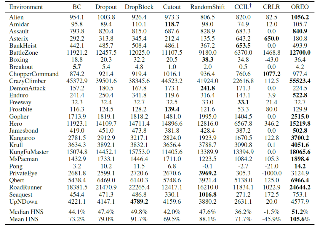 首先,考虑混淆雅达利游戏(confounded Atari games)环境,这是 De Haan 等人(2019) 所提出的考察因果混淆问题的环境,其中游戏图像的每一帧都额外显示玩家上一步采取的动作。如表3所示,OREO 方法在大部分游戏中都取得了最好的表现。特别地一点,OREO 方法胜过在空间区域上随机掩盖的方法(Dropout, DropBlock)、数据增广(data augmentation)方法(Cutout, RandomShift)、以及空间式地随机掩盖 beta-VAE 所学编码的方法(CCIL)[De Hann’19],说明了用察觉对象的方式进行正则化的优势。OREO 也胜过了因果预测方法 CRLR,说明简单直接地应用因果方法并不一定有效,因为其假设在模仿学习任务中并不成立,例如图像数据各维度间并没有明确的因果关系,且变量关系也非线性。图10的可视化结果表明,行为克隆所学到的策略确实仅关注个别物体,而 OREO 学到的则更广泛地关注图中的相关对象。对于真实场景任务,研究员们也考察了在 CARLA 驾驶模拟环境中的表现。表4中的结果表明 OREO 也取得了最好的表现。论文原文及附录中提供了更多实验结果。