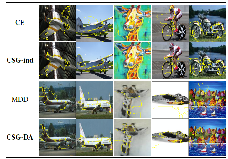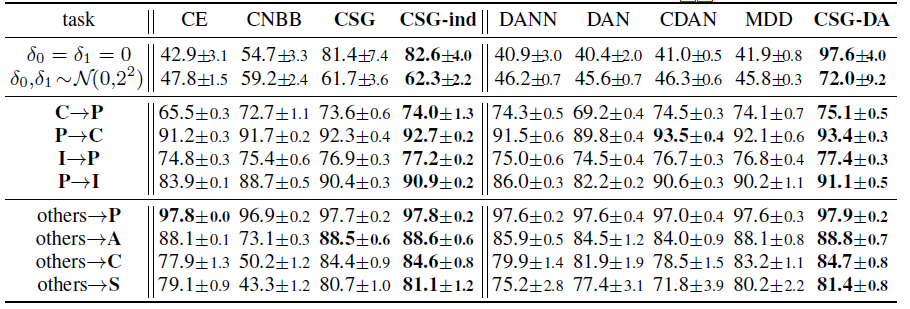 研究员们设计了一个只包含数字0和1的“平移 MNIST”数据集,其中训练数据中的0被有噪地向左平移5像素,而1向右。除了原本的测试集,研究员们也考虑将其中的数字用零均值噪声平移。更加真实的任务包括 ImageCLEF-DA,PACS 和 VLCS(附录)。表1中的结果表明,对于分布外泛化,CSG 胜过标准监督学习(cross-entropy,CE)及判别式因果方法 CNBB,同时 CSG-ind 也胜过 CSG,表明了使用独立先验用于预测的好处。对于领域自适应,CSG-DA 也胜过当前流行的方法。图4中的可视化分析表明所提方法更关注图片中有语义信息的区域和形状。