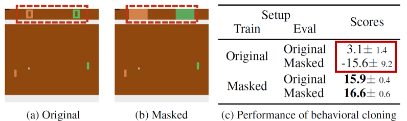 研究员们发现,因果混淆问题在一般的场景中广泛存在。如图7所示,原本环境下学到的策略表现远不如训练时将分数掩盖掉的好。原环境中,策略模型会仅仅依赖于画面中的分数给出动作,因为它与专家动作的关系紧密而敏感,但却不知这只是专家动作的结果,所以在使用中不能采取有效的动作。而在分数被掩盖的环境中,策略模型不得不寻找其他线索来预测专家动作,才得以发现真实规律。