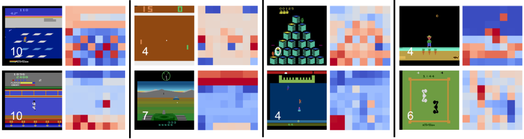 图10:使用行为克隆(第一行)及 OREO 方法(第二行)在混淆雅达利环境(左列)及原本的雅达利环境(右列)下学到的策略模型的可视化结果