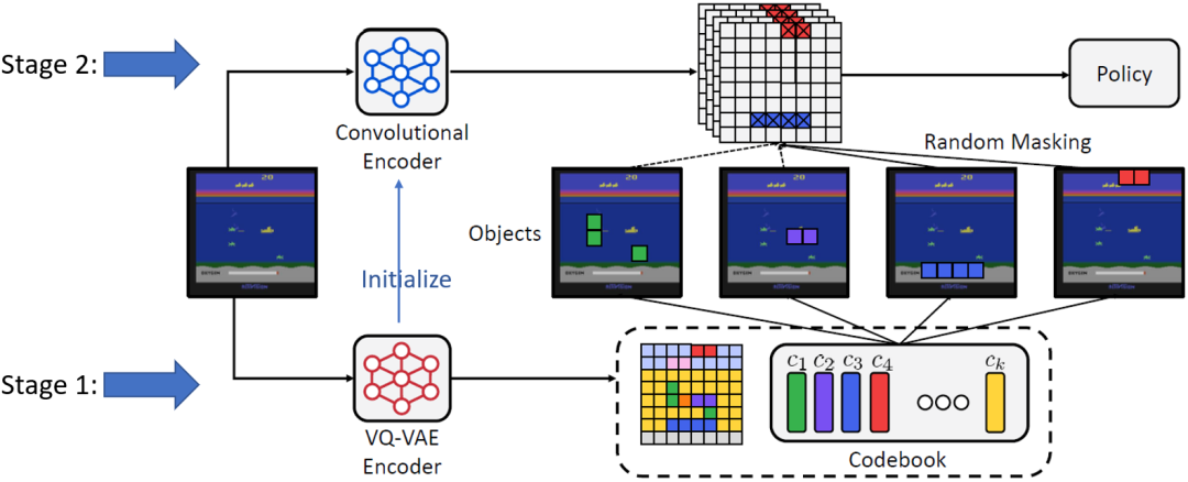 对于第二个任务,研究员们对每一个离散编码的值随机地决定是否选择它,并在图像的 VQ-VAE 编码中掩盖掉具有所选离散值的格点。此操作掩盖掉了编码中的一些对象,迫使策略模型关注未被掩盖掉的对象,避免仅关注个别对象。这是与现有方法最大的不同,现有方法掩盖掉的都是空间上相近的区域,并不反映具有语义的对象。因此,此方法被称为“察觉对象的正则化方法”(Object-aware REgularizatiOn,OREO)。图9展示了 OREO 方法的流程。第一阶段训练 VQ-VAE 提取对象表示,第二阶段学习基于 VQ-VAE 编码的策略模型,其间通过所述随机掩盖对象的方法做正则化。