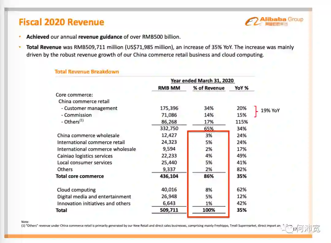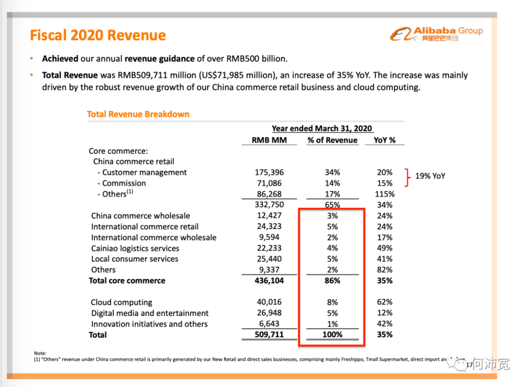 作为一个交易平台,GMV背后是在线营销费(用户管理,customer management)和交易佣金分成(一般在0.3~5%),阿里核心电商2020财年的收入是2463亿元人民币。平均下来可以理解为电商100元交易额,阿里系收取了3元(3%)服务费。