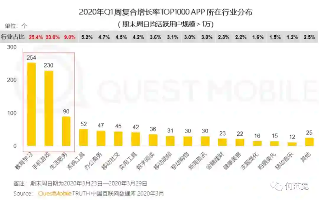 再者,教育行业在各行业增长率对比中呈现出最突出的数据:2020 年第一季度复合增长率top1000的App中,教育行业占比25%,移动购物占比仅为3%。