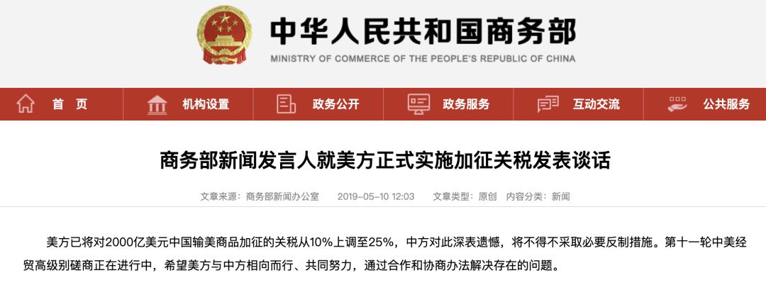 美方已将2000亿美元中国输美商品的关税从10%上调至25%,中方对此深表遗憾,将不得不采取必要反制措施。第十一轮中美经贸高级别磋商正在进行中,希望美方与中方相向而行、共同努力,通过合作和协商办法解决存在的问题。