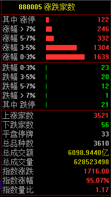 个股方面,其中超百股涨停,上涨的个股高达3521家,仅21家跌停。而A股总市值今天暴增了1.74万亿。