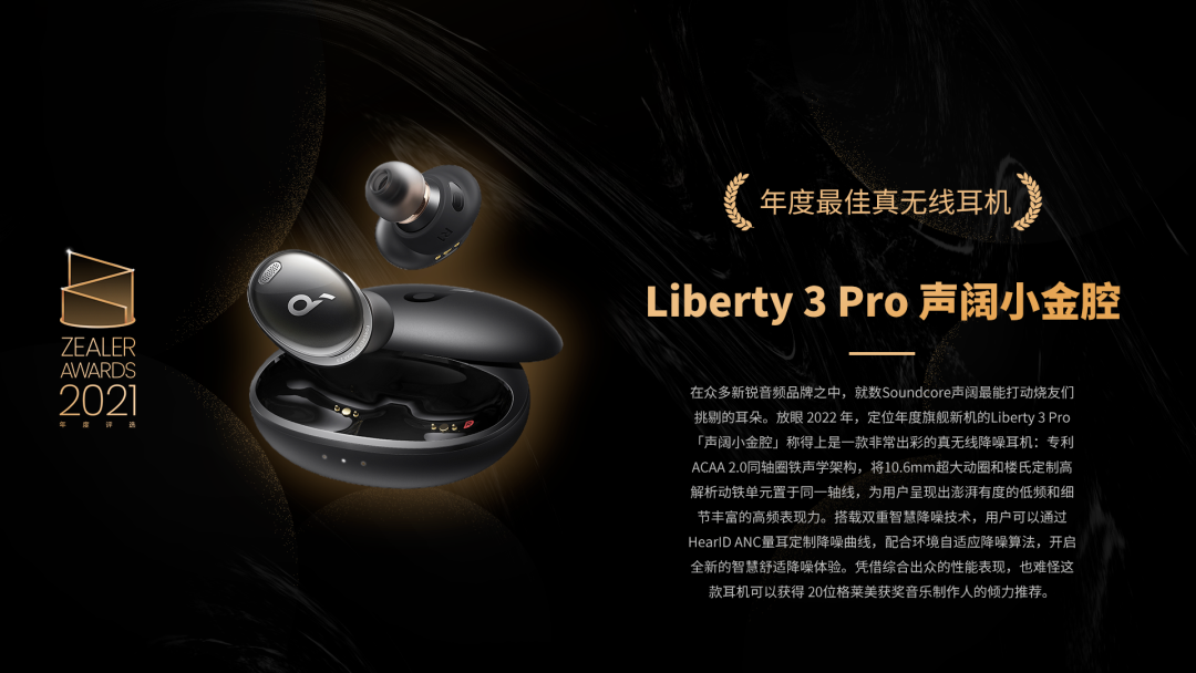 在众多新锐音频品牌之中,就数 Soundcore 声阔最能打动烧友们挑剔的耳朵。放眼 2022 年,定位年度旗舰新机的 Liberty 3 Pro「声阔小金腔」称得上是一款非常出彩的真无线降噪耳机:专利 ACAA 2.0 同轴圈铁声学架构,将 10.6mm 超大动圈和楼氏定制高解析动铁单元置于同一轴线,为用户呈现出澎湃有度的低频和细节丰富的高频表现力。搭载双重智慧降噪技术,用户可以通过 HearID ANC 量耳定制降噪曲线,配合环境自适应降噪算法,开启全新的智慧舒适降噪体验。凭借综合出众的性能表现,也难怪这款耳机可以获得 20位格莱美获奖音乐制作人的倾力推荐。