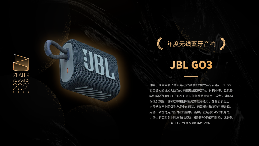 作为一款常年霸占各大电商热销榜的便携式蓝牙音箱,JBL GO3 有足够的资格成为这次的年度无线蓝牙音响。体积小巧,且具备防水防尘的 JBL GO3 几乎可以应付各种使用场景,较为先进的蓝牙 5.1 方案,也可以带来相对稳定的连接能力。在音质表现上,它虽然称不上同级别产品中的翘楚,可是相对均衡的三频表现,完全不会愧对用户所付出的成本。当然,在足够小巧的机身之下,它也能实现 5 小时左右的续航,相对舒心的使用体验,或许就是 JBL 小金砖系列的取胜之道。