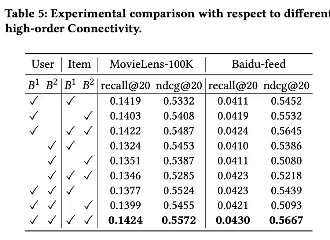 4. 下表为是否添加高阶连接建模对实验效果的影响,在 User 侧和 Item 侧都添加的效果最佳;