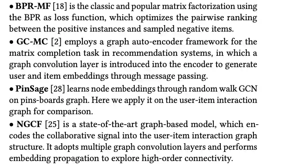 选取的对比算法基线为 BPR-MF,GC-MC,PinSage,NGCF 等比较有代表性的建模方法,细节见下列各算法原文的引用。