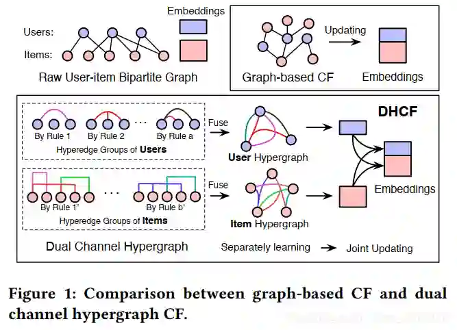 针对以上两个问题,论文提出了双通道超图卷积网络协同过滤的框架DHCF(Dual Channel Hypergraph Collaborative Filtering):