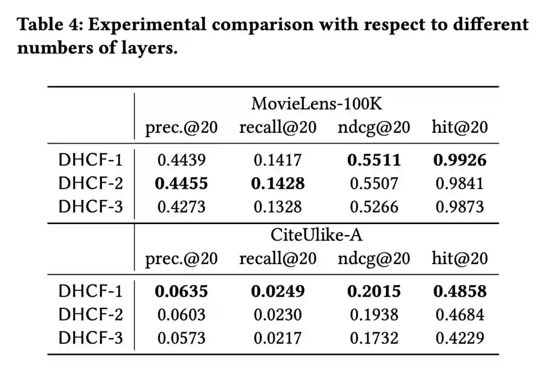 1. 下表为 DHCF 对比基线的实验结果,在4个数据集的4个指标上都有最好的表现;