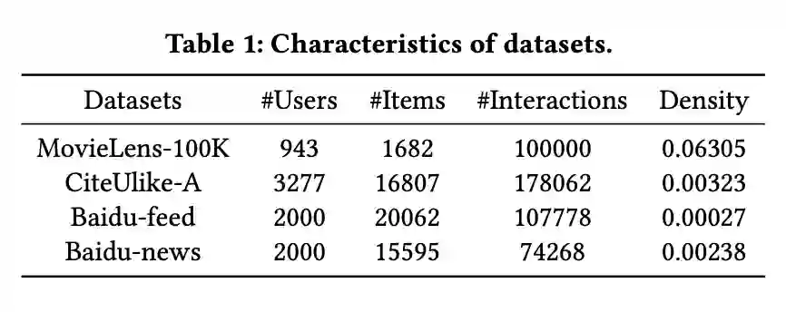 使用数据集如下,其中Baidu-feed和Baidu-news都是从真实数据集上随机抽取的,MovieLens 和 CiteUlike-A 则为公开数据集。