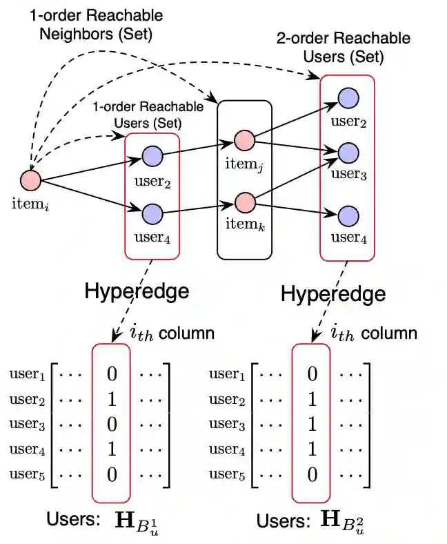 论文里只考虑了1阶、2阶连接,下图给出了如何构造user超图关联矩阵。