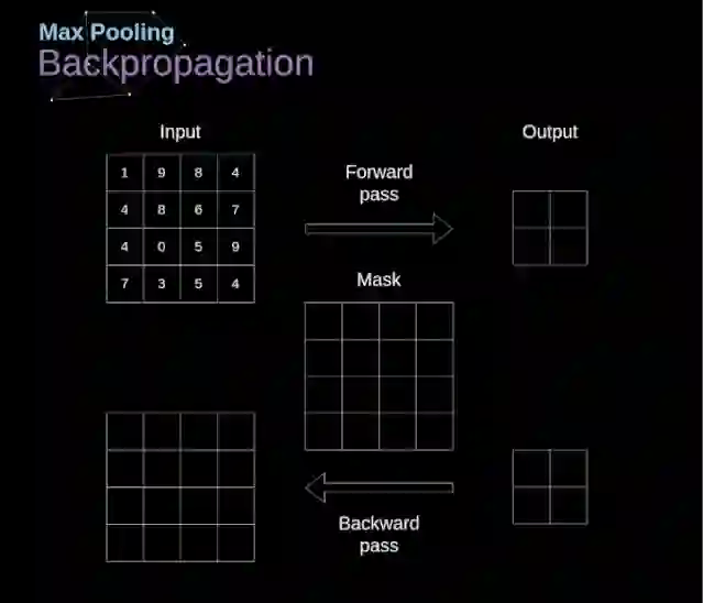 在本文中,我们将只讨论最大值池化的反向传播,但是我们将学习的规则只需要稍加调整就可以适用于所有类型的池化层。由于在这种类型的层中,我们没有任何必须更新的参数,所以我们的任务只是适当地分布梯度。正如我们所记得的,在最大值池化的正向传播中,我们从每个区域中选择最大值,并将它们传输到下一层。