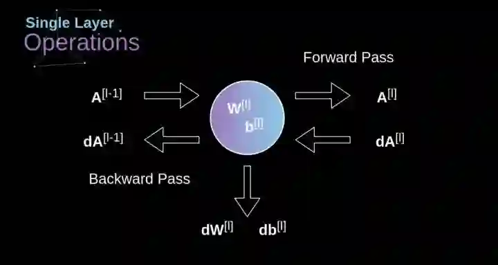 我们的任务是计算dW[l]和db[l]——它们是与当前层参数相关的导数,以及dA[l -1]的值——它们将被传递到上一层。如图10所示,我们接收dA[l]作为输入。当然,张量dW和W、db和b以及dA和A的维数是相同的。第一步是通过对输入张量的激活函数求导得到中间值dZ[l]。根据链式法则,后面将使用这个操作得到的结果。