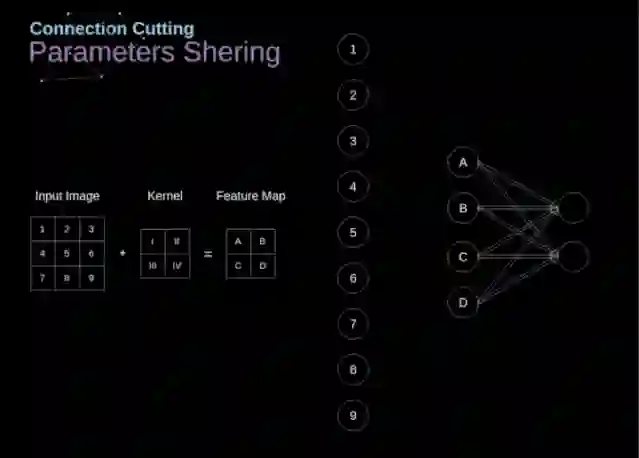其次,我们看到一些神经元共享相同的权重。这两个性质都意味着我们需要学习的参数要少得多。