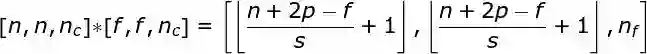 如果我们想在同一幅图像上使用多个滤波器,我们分别对它们进行卷积,将结果一个叠在一起,并将它们组合成一个整体。接收张量的维数(即我们的三维矩阵)满足如下方程:n-图像大小,f-滤波器大小,nc-图像中通道数,p-是否使用填充,s-使用的步幅,nf-滤波器个数。