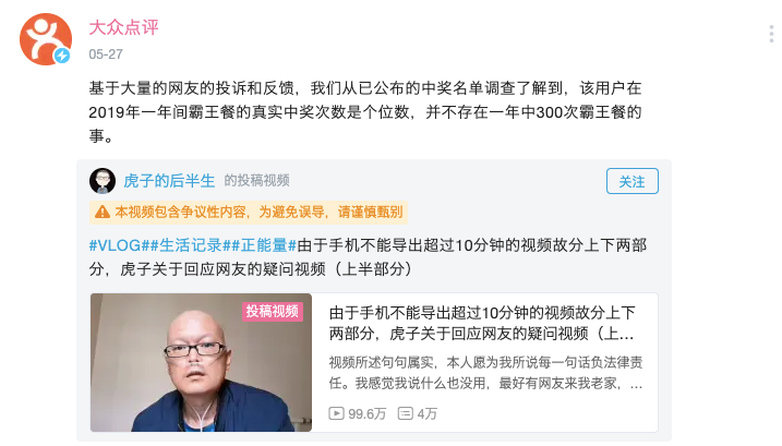 大众点评的 B 站的官方账号回应称,虎子去年的霸王餐中奖次数只有个位数,不可能一年吃 300 次霸王餐。而虎子也悄悄删除了那期回应的视频。