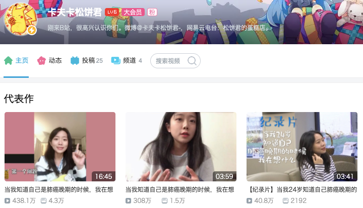 以癌症病人为例,在虎子之前,另一位同样自称肺癌晚期的 UP 主@卡夫卡松饼君的也曾引起过争议。