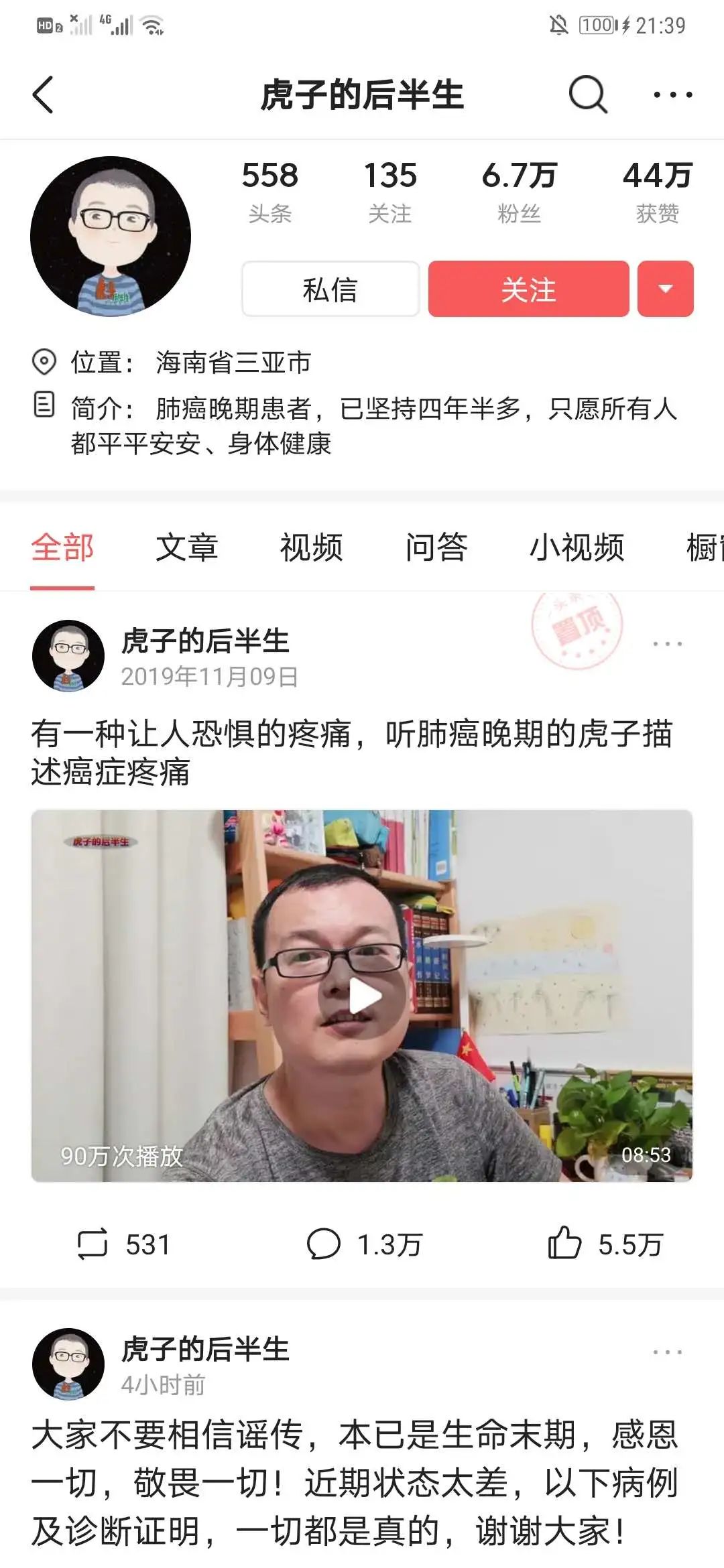 在之后的几个月里,虎子又发布了 140 多条视频,内容都是自己抗癌的日常,虎子的儿子也不时出镜,其中一条虎子陪儿子坐公交的视频,是播放量最高的一条。