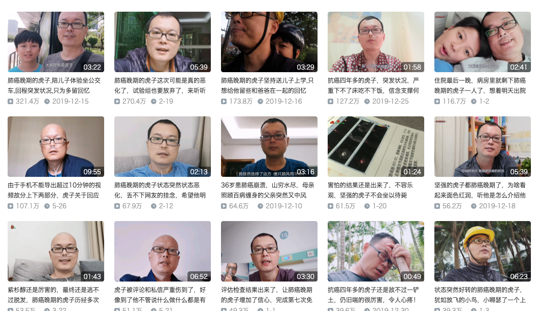 2019年 12 月 10 日,UP 主 @虎子的后半生凭借一条视频在 B 站火了,视频的标题是:《36岁患肺癌崩溃,山穷水尽,母亲照顾百病缠身的父亲突然又中风》。