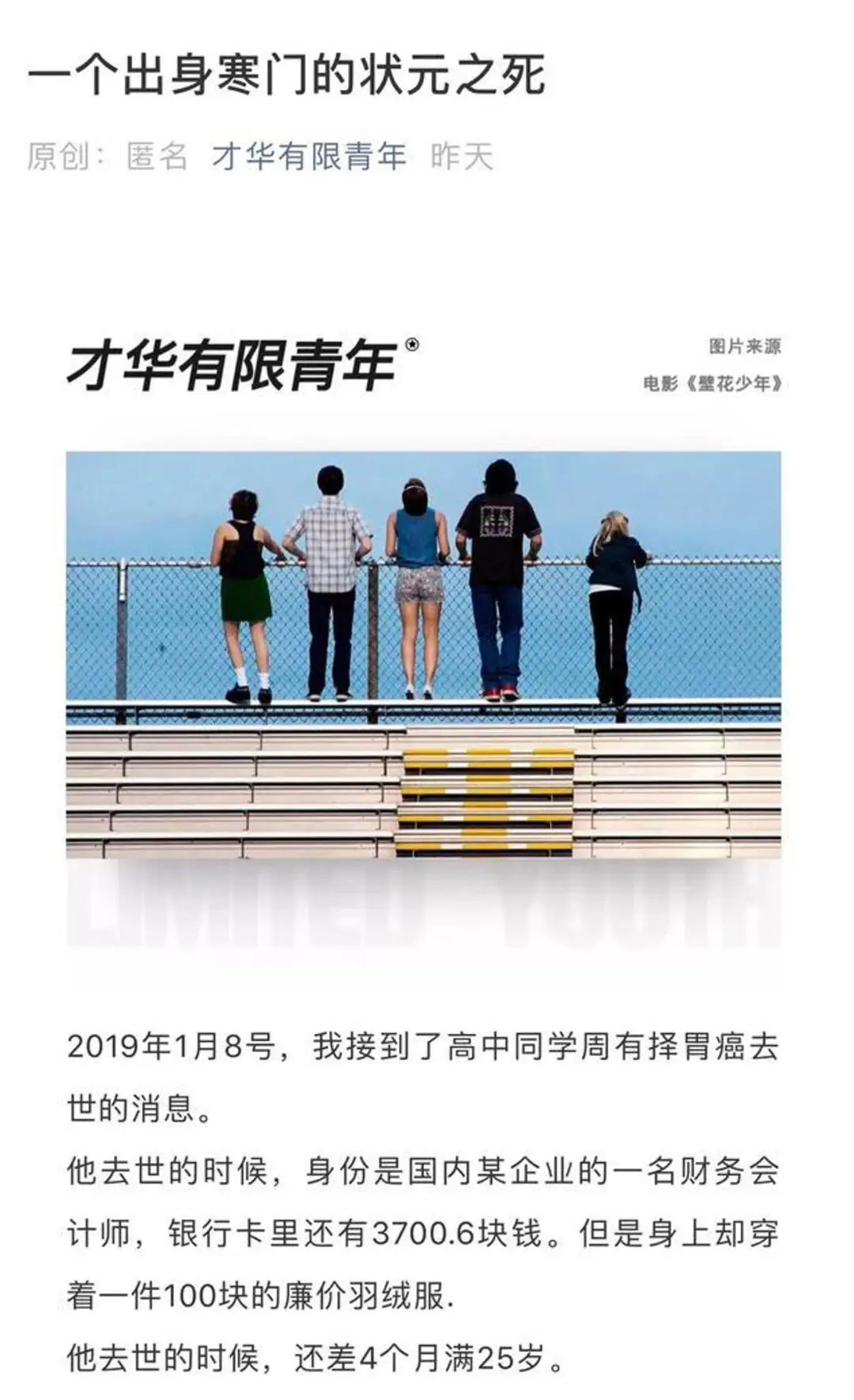 而故事的类型也远不止只有患病,「咪蒙系」公众号同样深谙此道。还记得去年刷屏的《一个出身寒门的状元之死》吗?就把编故事上升到了「非虚构的写作」的高度。