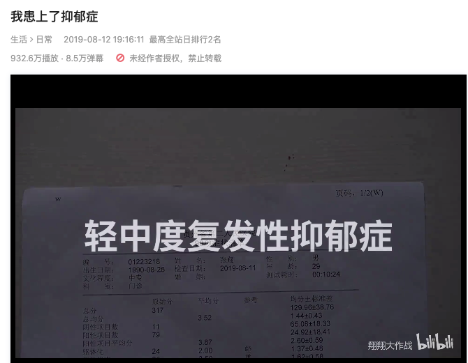 说起抑郁症,最著名的 B 站 UP 主就是@翔翔大作战,一条标题为《我患上了抑郁症》的 3 分钟视频,就在收获 900 多万的播放量,成为 B 站抑郁症头部博主。