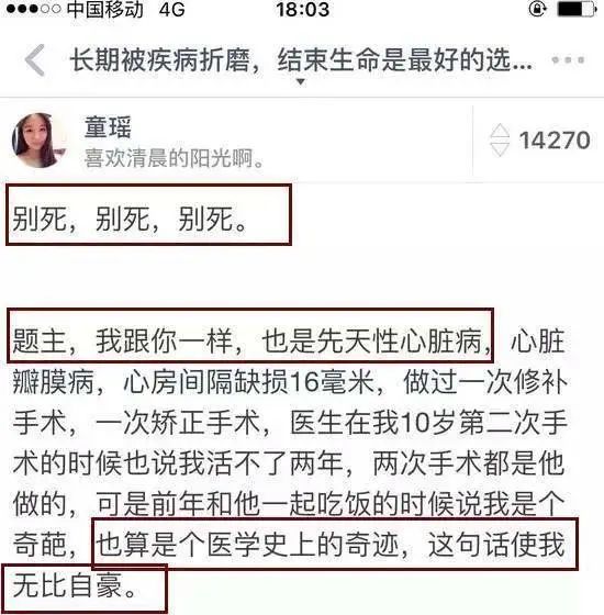 2015 年,就有一位患有先天性心脏病的女大学生,在知乎发了一篇题为《长期被疾病折磨,结束生命是最好的选择吗?》的帖子,表示自己无法忍受病痛折磨,想要放弃治疗。