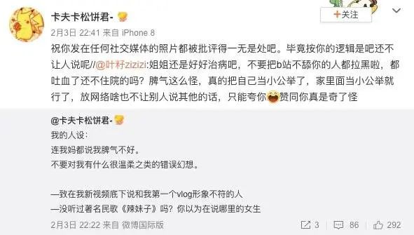 而卡夫卡松饼君也开始拉黑并人肉、挂出一些质疑她的网友,甚至有网友因为受不了粉丝的攻击而删掉了微博账号,这也成为了卡夫卡松饼君的另一个争议点。