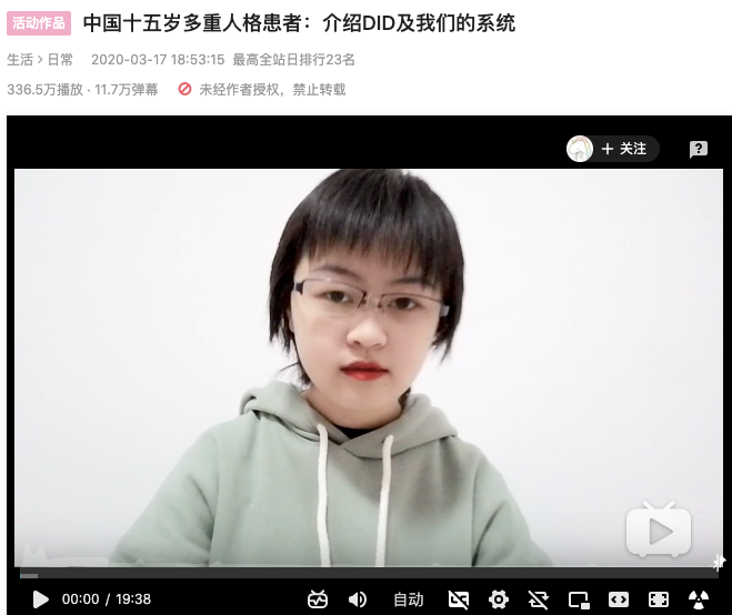 还有一位自称有 30 种人格 UP 主 @SystemAMWE,通过主人格 Ariel 在 B 站讲述自己患有多重人格的经历。