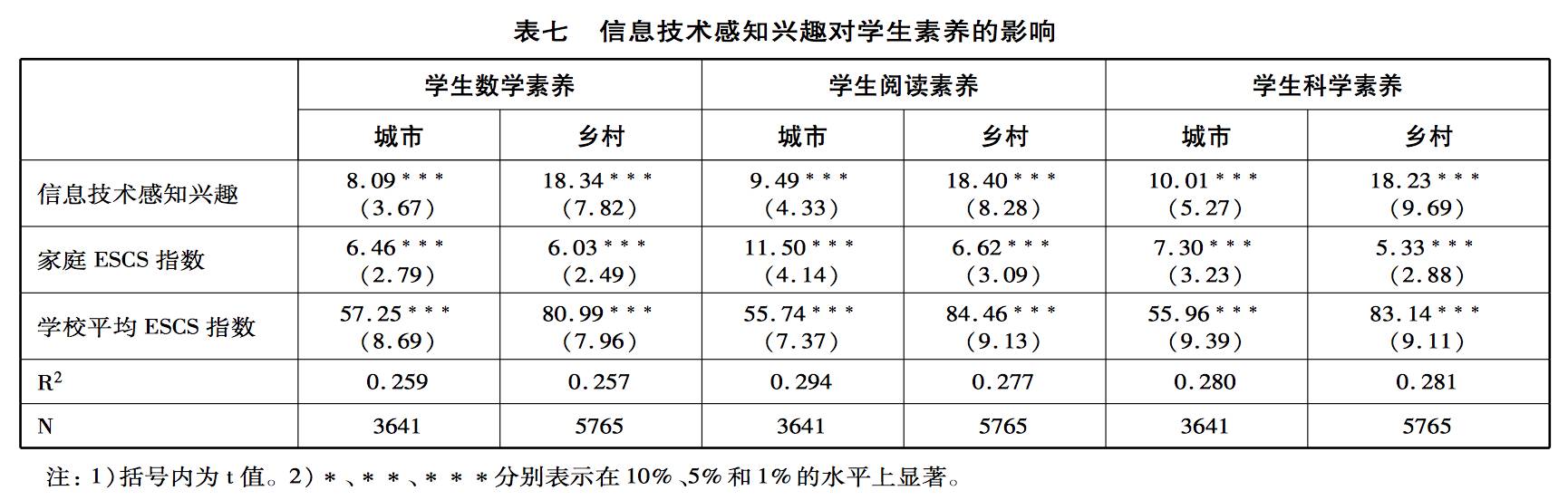 从理论上来说,对信息技术有浓厚兴趣的学生大多会积极运用最新发展的信息技术学习新知识和新技能,基于兴趣习得的知识和技能对学生信息素养及学业水平会产生正向的促进作用。为了检验两者之间的关系,本研究重点考察信息技术感知兴趣对学生数学、阅读及科学素养的影响(见表七)。