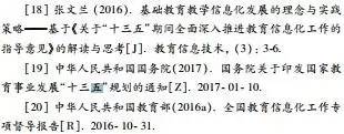 20世纪90年代末以来,我国中小学教育信息化建设进入快速发展的“黄金时期”。截至2016年6月,全国中小学校接入互联网的比例达到87.5%,较2014年的82.2%上升了5.3个百分点,其中接入10M以上带宽的学校从2014年的41%提高到2016年的64.3%;全国中小学校全部配备多媒体教学设备的普通教室所占比例至2016年达到56.6%,较2014年的39.2%提高了174个百分点(中华人民共和国教育部,2016a)。互联网在中小学校覆盖面不断扩大,但是不同地区、省份之间教育信息化水平仍存在较大差距。2016年全国教育信息化工作专项督导报告数据显示,我国东部地区中小学校互联网接入比例平均为94.61%,比中部、西部地区分别高10%和10.49%;中小学校10M以上带宽接入比例在东部地区平均为76.95%,比中部、西部地区分别高1.69%和24.83%。而在省份内部,城乡间、区域间、校际间的教育信息化基础支撑环境建设也存在较大差距。值得关注的是,尽管信息技术设备不断更新换代,但是大多数中小学教师在信息技术教学应用能力上仍停留在浅层次水平,没有熟练掌握深化应用信息技术的有效路径及方法,难以充分发挥信息技术提升教育教学质量的正向效应。