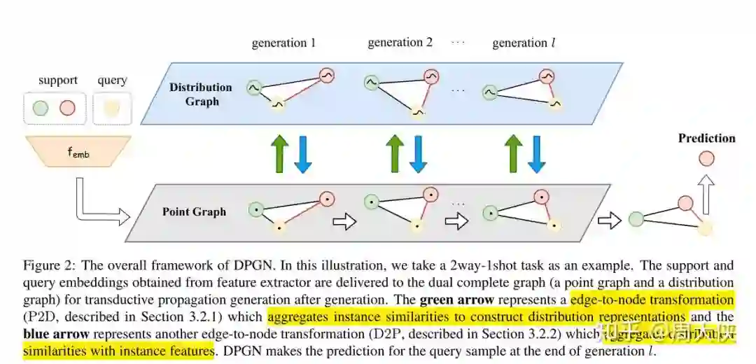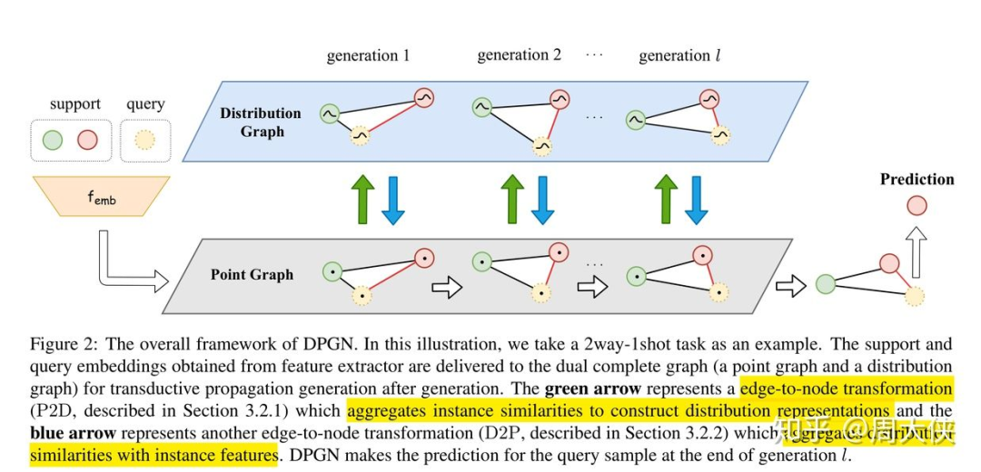 图2展示了模型的主要过程。DPGN包含l轮的更新(generations),每一次更新包括一个点图(PG)和分布图(DG)
