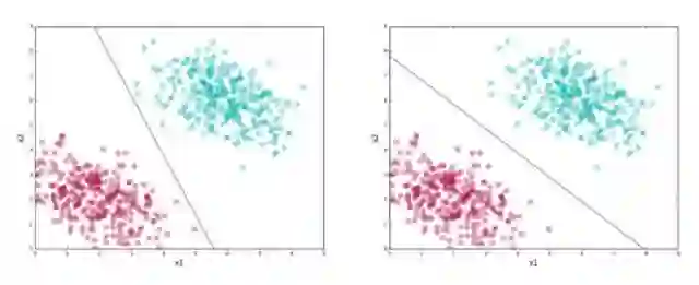 有一个很有趣的问题:以上两条线都将红色和绿色的点群集分离开来。有什么合理依据能让我们选择其中一个而舍弃另一个吗?
